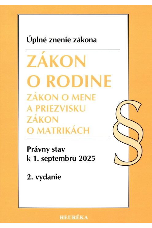 Publikácia obsahuje aktualizované úplné znenie zákonov s právnym stavom k 1. septembru 2025: Zákon č. 36/2005 Z.z. o rodine so zmenami poslednej novelizácie - zákona č. 157/2025?? Z.z. s účinnosťou k 1. augustu 2025; Zákon č. 300/1993 Z.z. o mene a priezvisku so zmenami poslednej novelizácie - zákona č. 408/2022 Z.z.; a Zákon č. 154/1994 Z.z. o matrikách so zmenami poslednej novelizácie - zákona č. 361/2024 Z.z.