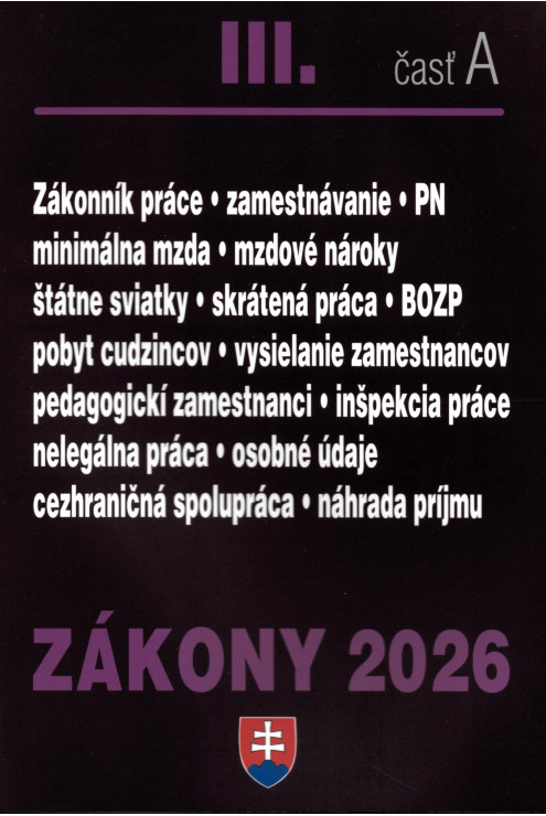 Publikácia obsahujúca najdôležitejšie právne predpisy z pracovnoprávnej oblastí, miezd, zamestnanosti, BOZP a správneho práva. Všetky právne predpisy obsahujú zmeny k 1. 1. 2026 a sú uvádzané v úplnom znení. Zmeny v zákonoch sú v texte prehľadne vyznačené. Hlavné témy: Zákonník práce, Minimálna mzda, Služby zamestnanosti, Inšpekcia práce, BOZP, Ochrana osobných údajov.