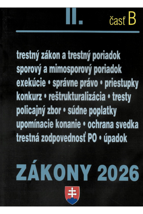 Publikácia obsahujúca najdôležitejšie právne predpisy z oblasti trestného práva, exekúcii, správneho práva a riešenia súdnych sporov v úplnom znení. Všetky právne predpisy obsahujú zmeny k 1. 1. 2026. Zmeny v zákonoch sú v texte prehľadne vyznačené. Hlavné témy: Trestný zákony, Trestný poriadok, Policajný zbor, Konkurz a reštrukturalizácia, Exekučný poriadok, Priestupky, Správny poriadok.