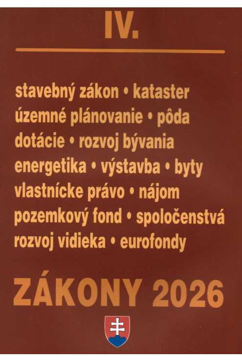 Titul Stavebný zákon a územné plánovanie obsahuje úplné znenie novelizovaných zákonov, vyhlášok a opatrení z oblastí stavebníctva a rozvoja bývania. V publikácií sú zákony venované územnému plánovaniu, vlastníctvu bytov a nebytových priestorov, výstavbe, štátnej podpore nájomného bývania, energetike, pozemkovým spoločenstvám, vlastníctvu k pozemkom a iné. Všetky právne predpisy obsahujú zmeny k 1. 1. 2026. Zmeny v zákonoch sú v texte prehľadne vyznačené.